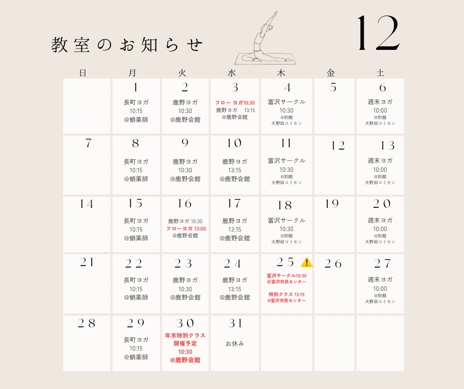 ※12月25日 「木曜日 10:30~富沢ヨガサークル」は富沢市民センターとなります。